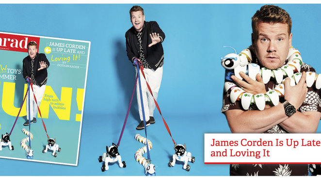 CHiP has fun with James Corden on the cover of Parade Magazine. Inside, CHiP stars in the article "25 of the Hottest New Toys of Summer".